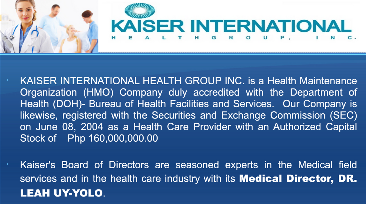 Kaiser ay isang HMO Company duly accredited ng DOH Bureau of Health Facilities Services